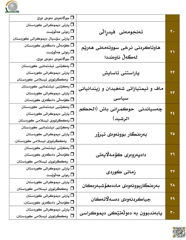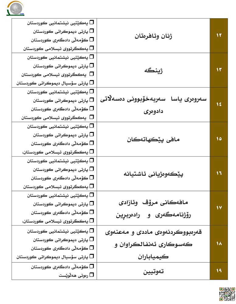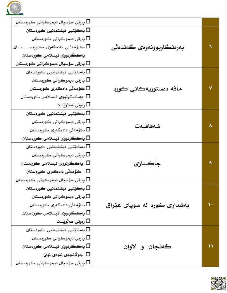 (یەکێتیی نیشتمانیی کوردستان، پارتی دیموکراتی کوردستان، یەکگرتووی ئیسلامی کوردستان، کۆمەڵی دادگەری کوردستان، رەوتی هەڵوێست، جوڵانەوەی جوڵانەوەی نەوەی نوێ و پارتی سۆسیال دیموكراتی كوردستان، بەرەی گەلەکەمان، بەرەی تورکمانی)